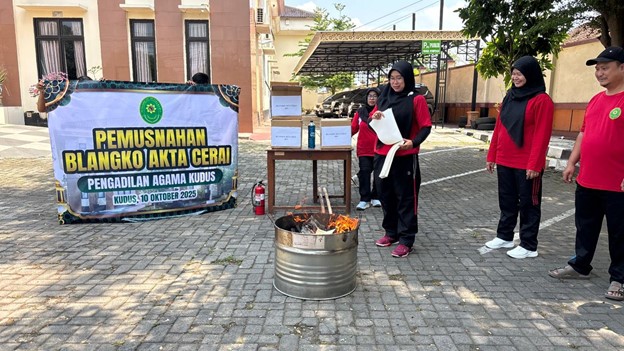 Kudus, 10 Oktober 2025 — Sebagai wujud komitmen terhadap transformasi digital di lingkungan peradilan agama, Pengadilan Agama Kudus melaksanakan kegiatan pemusnahan blangko akta cerai fisik yang sudah tidak digunakan. Kegiatan ini dipimpin langsung oleh Ketua Pengadilan Agama Kudus, Ibu Siti Alosh Farchaty, S.H.I., M.H., didampingi oleh Wakil Ketua, Ibu Rohayatun, S.H.I., M.H., serta disaksikan oleh jajaran Kepaniteraan dan Kesekretariatan PA Kudus di halaman kantor Pengadilan Agama Kudus pada Jumat, 10 Oktober 2025.