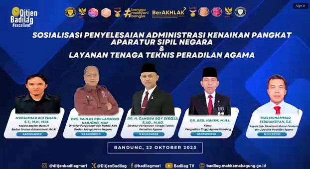 Sosialisasi yang dibuka oleh Mas Muhammad Ferdiansyah, S.E., Kepala Sub Direktorat Mutasi Panitera dan Juru Sita Peradilan Agama selaku moderator, menghadirkan narasumber dari BKN yaitu Drs. Paulus Dwi Lamsono Nabijono, MAP, serta pejabat dari Badilag MA RI. Materi yang disampaikan meliputi inovasi layanan administrasi kenaikan pangkat, otomasi kenaikan pangkat berbasis data SIASN, dan peningkatan efisiensi manajemen kepegawaian. Berdasarkan Peraturan BKN Nomor 4 Tahun 2025, kini terdapat 12 periode kenaikan pangkat setiap tahun, yang bertujuan mempercepat pengembangan karier ASN dan meningkatkan kualitas pelayanan publik.