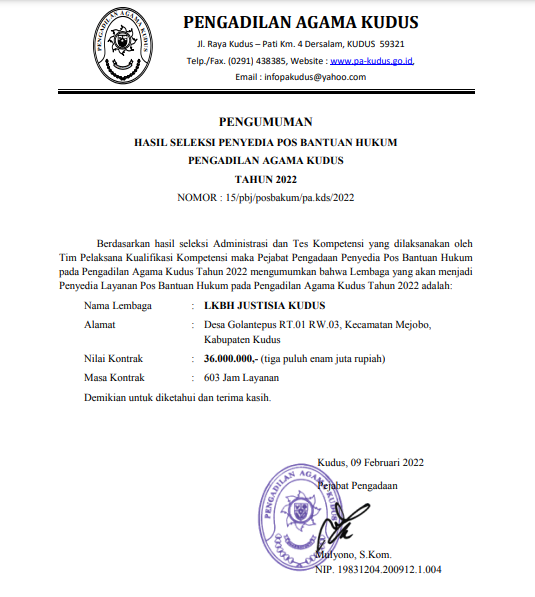 PENGUMUMAN HASIL SELEKSI POS BANTUAN HUKUM PENGADILAN AGAMA KUDUS TAHUN 2022